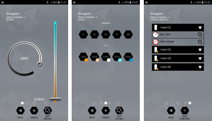 Für die Sicherheit der Anlage kann ein Passwort vergeben werden. Dieses kann jederzeit in den Einstellungen geändert werden. Bei der Erstinstallation kann ein Name vergeben werden, wie Raumnummer oder Mitarbeitername. Sind alle Komponenten erkannt worden, so können Gruppen eingerichtet werden, Szenen für bestimmte Anforderungen gespeichert werden, der Bewegungsmelder konfiguriert werden oder die DALI Input Unit programmiert werden.