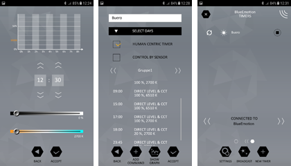 Herzstück des BlueEmotion Systems ist der programmierbare Timer. Um einen Tageslichtverlauf nachstellen zu können, werden im 24 Stunden Tageslichtverlauf zu bestimmten Zeiten Helligkeits- und Farbwerte gesetzt, die dann innerhalb der Zeitintervalle linear angesteuert werden. So erreicht man einen quasi Tageslichtverlauf, der den des realen Tageslichtverlaufes entspricht. Es können mehrere Timer, je nach Anforderung und Aufgabe, programmiert werden.