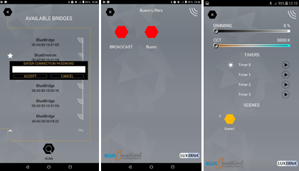 Die BlueEmotion Nutzer App ist die Anwendungssoftware für das BlueEmotion System. Hier können für das System notwendige Parameter eingestellt werden. So kann die Helligkeit und die Farbtemperatur geändert werden, der Timer ein- und ausgeschaltet werden oder bestimmte Szenen aufgerufen, wenn diese vorher programmiert wurden. Falls in einem DALI System mehrere Gruppen vorhanden sind, können sie vorher auswählen, welche Gruppe gesteuert werden soll. Sollen alle gleichzeitig gesteuert werden, kann man dieses über den Broadcast realisieren.
