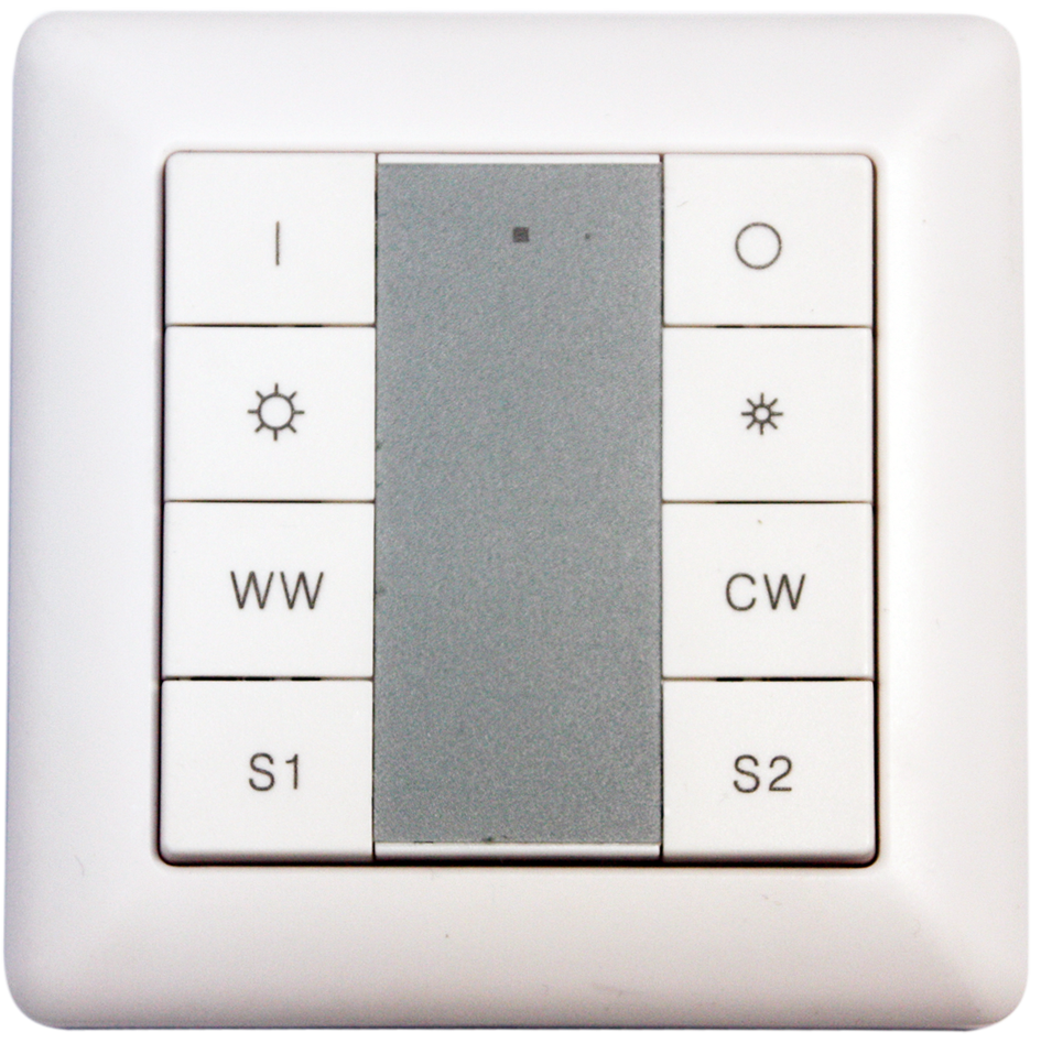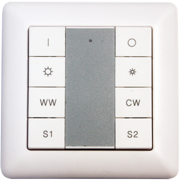 Der Taster wird über die DALI Leitung angeschlossen und benötigt keine externe Stromversorgung. Der Rahmen ist austauschbar und lässt sich an das Rahmenprogramm unterschiedlicher Hersteller anpassen.