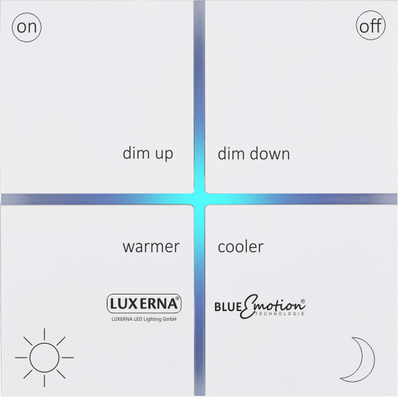 Die individuelle Einstellung von Farben oder Helligkeiten regelt man über den Bluetouch Taster. Über das voreingestellte Profil kann das System ein und ausgeschaltet werden, hoch und runtergedimmt werden und Farbtemperaturen eingestellt und geändert werden. Wenn ein Timerprogramm aktiv ist, kann der Timer ein und ausgeschaltet werden. Es können auch individuelle Szenen, in Abhängigkeit der geforderten Anforderungen, programmiert und auf die dafür vorgesehenen Tastflächen hinterlegt und abgespeichert werden.