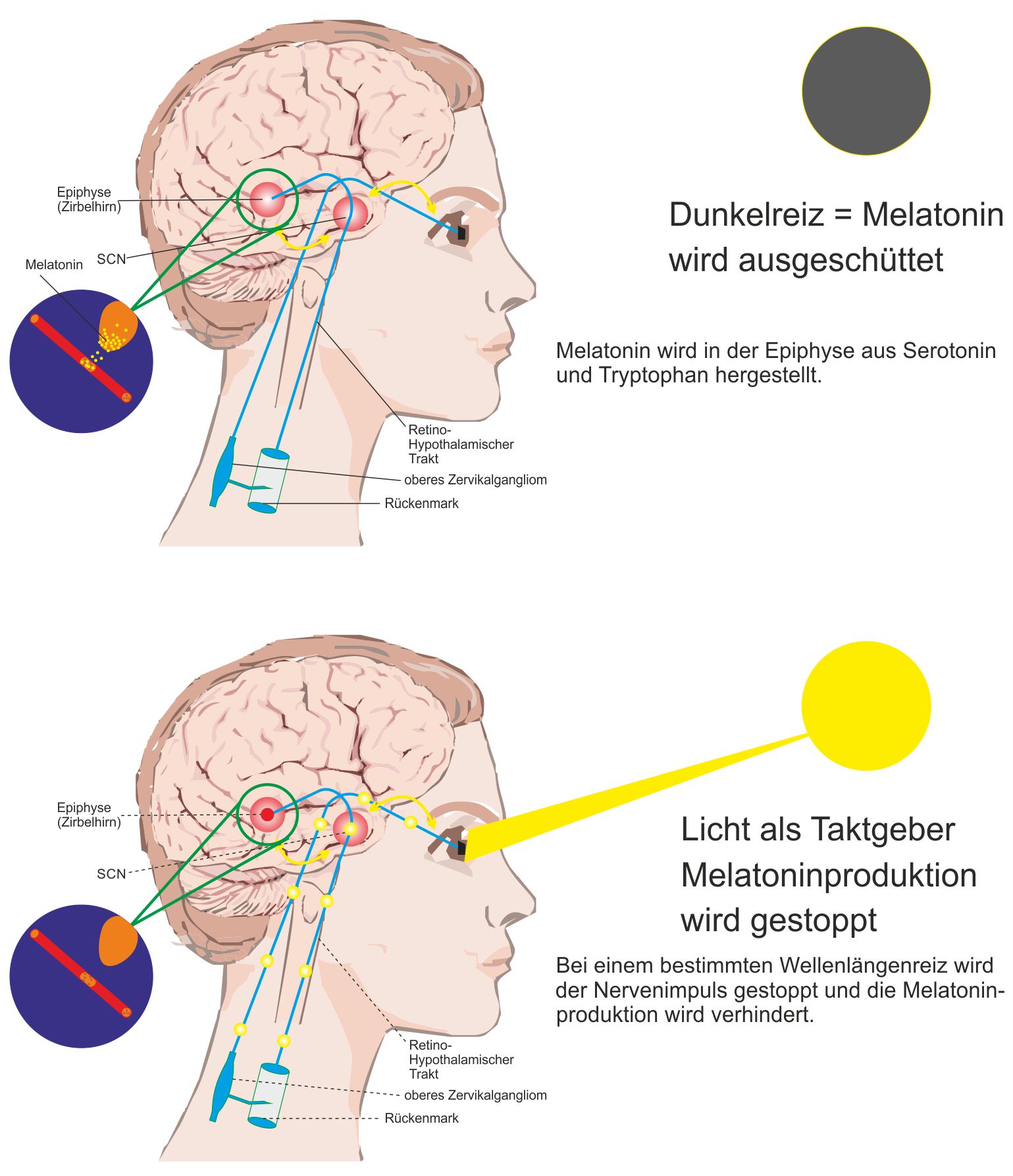 Dieses alles geschieht über den Suprachiasmatischem Nucleus, der als Regulator der inneren Uhr zählt. Er regelt über die Zirbeldrüse die Produktion des Schlafhormons Melatonin. Entscheidend für diese Regelung ist das Melanopsin in den Ganglienzellen. Im Gegensatz zu den anderen Photorezeptoren liegt die Empfindlichkeit des Melanopsin bei 490nm. Wird dieser Rezeptor nun durch einen Dunkelreiz aktiviert, so