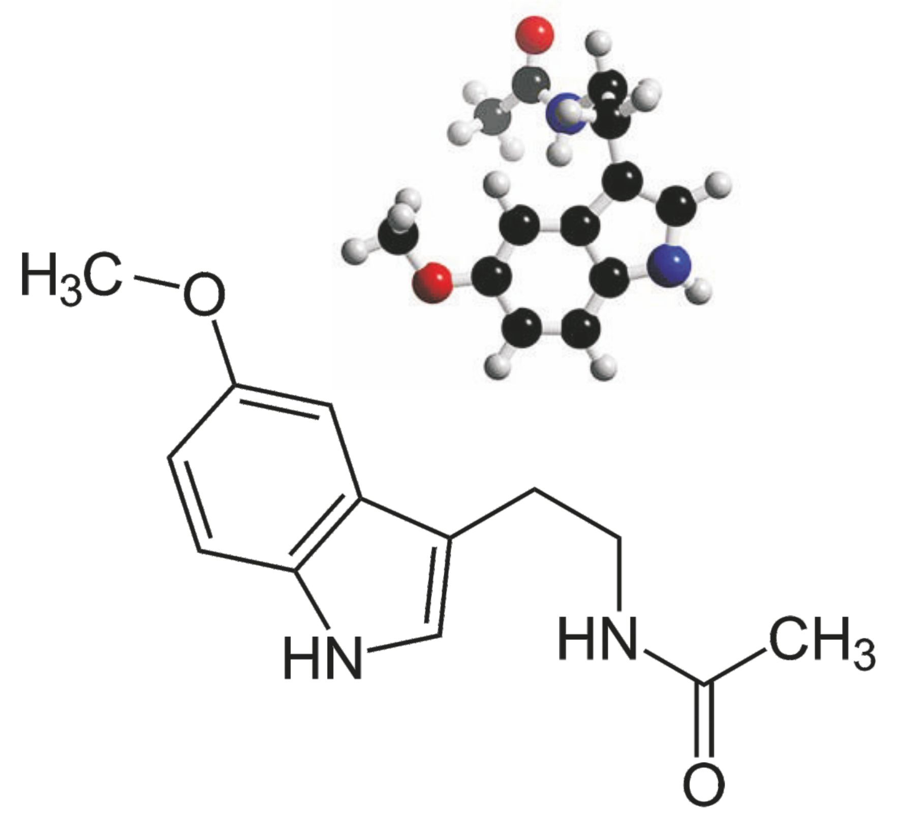 Das Melatonin [6,7,8] (N-Acetyl-5-methoxytryptamin) ist ein wichtiges Hormon des Stoffwechsels beim Menschen. Es wird in der Zirbeldrüse aus Serotonin gewonnen. Die Wirkungen des Melatonins sind vielfältig und spielt für die Steuerung des circadianen Rhythmus eine entscheidende Rolle. Die exakte Wirkung von Melatonin ist aber noch nicht genau geklärt und Gegenstand der Forschung.