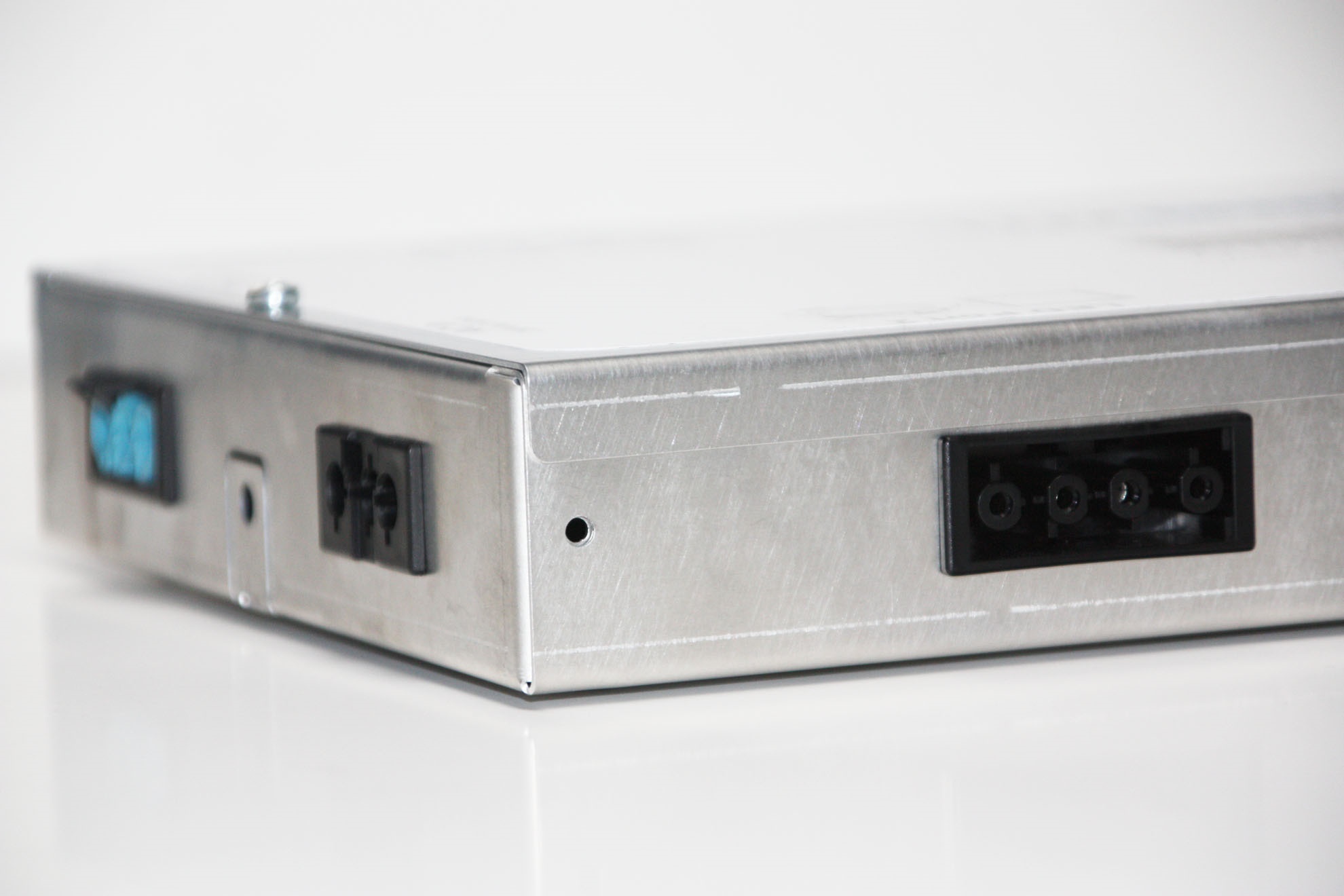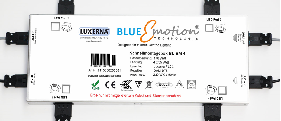 Die BlueEmotion Systembox beinhaltet die Stromversorgung und Steuerung des BlueEmotion Systems über Bluetooth. Alle im System befindlichen Komponenten haben einen codierten und verpolungssicheren Stecker. Alle Komponenten können gezielt und sicher mit der Systembox verbunden werden. Die Steuereinheit besitzt Anschlüsse für die Versorgung der LED Leuchtmittel, des Bluetouch Tasters und des MotionBlue Präsensmelders.